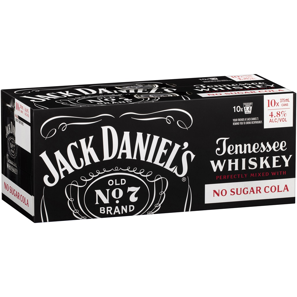 Jack Daniel's Tennessee Whiskey & No Sugar Cola 10 Pack Cans 375ml