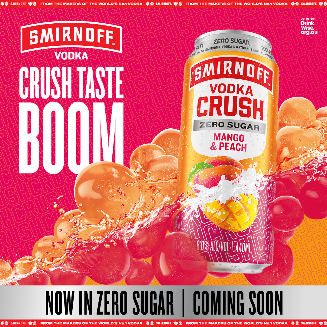 Say hello to your newest Crush, now with ZERO SUGAR. Everyone’s favourite; delicious Mango and juicy juicy Peach fruit flavours, mixed with the World’s #1 Vodka. Like a bass drop for your taste buds, Crush is a full-on flavour taste experience. Made with natural fruit flavours for a refreshing taste. 6% ABV in a BIG 440ml can.